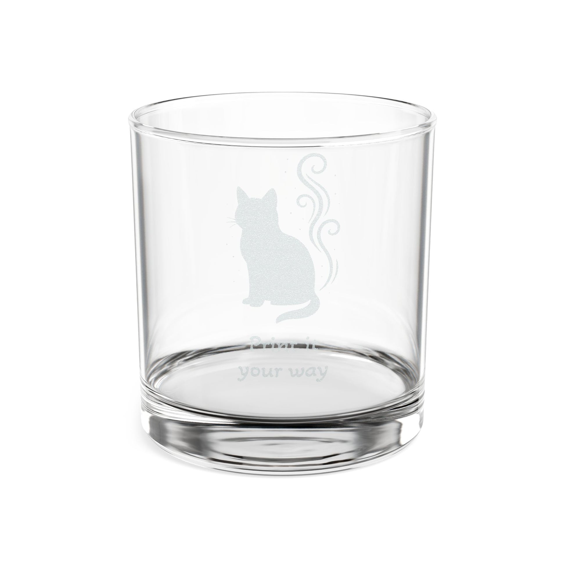 A low, weighty whiskey glass etched with a subtle cat silhouette and curling steam motif. The clear 10.5oz tumbler has a thick base that sits solid in your hand and shows off amber pours or an iced cocktail with understated elegance. The fine engraving reads softly on the glass — visible when held to light — giving each drink a quiet, personal touch. It washes easily in the dishwasher and works equally well for neat spirits, stirred cocktails, or a morning juice when you’re reaching for something simple and familiar. This piece fits into slow evenings, bookshelf nooks, and cozy conversations where small details matter.